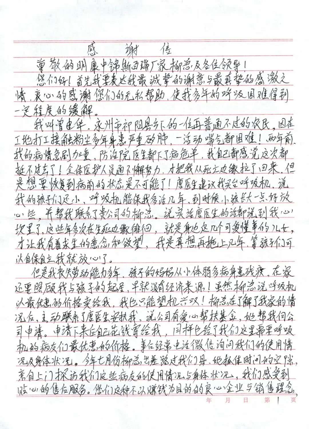 今天,我們公司收到了來(lái)自永州市祁陽(yáng)縣曾建華全家送來(lái)的錦旗,以及一封手寫(xiě)的沉甸甸的感謝信。