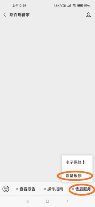 1. 首先打開手機(jī)微信在添加公眾“斯百瑞管家” ,點(diǎn)擊關(guān)注后,點(diǎn)擊售后服務(wù)菜單,選擇設(shè)備報(bào)修(如圖一),
