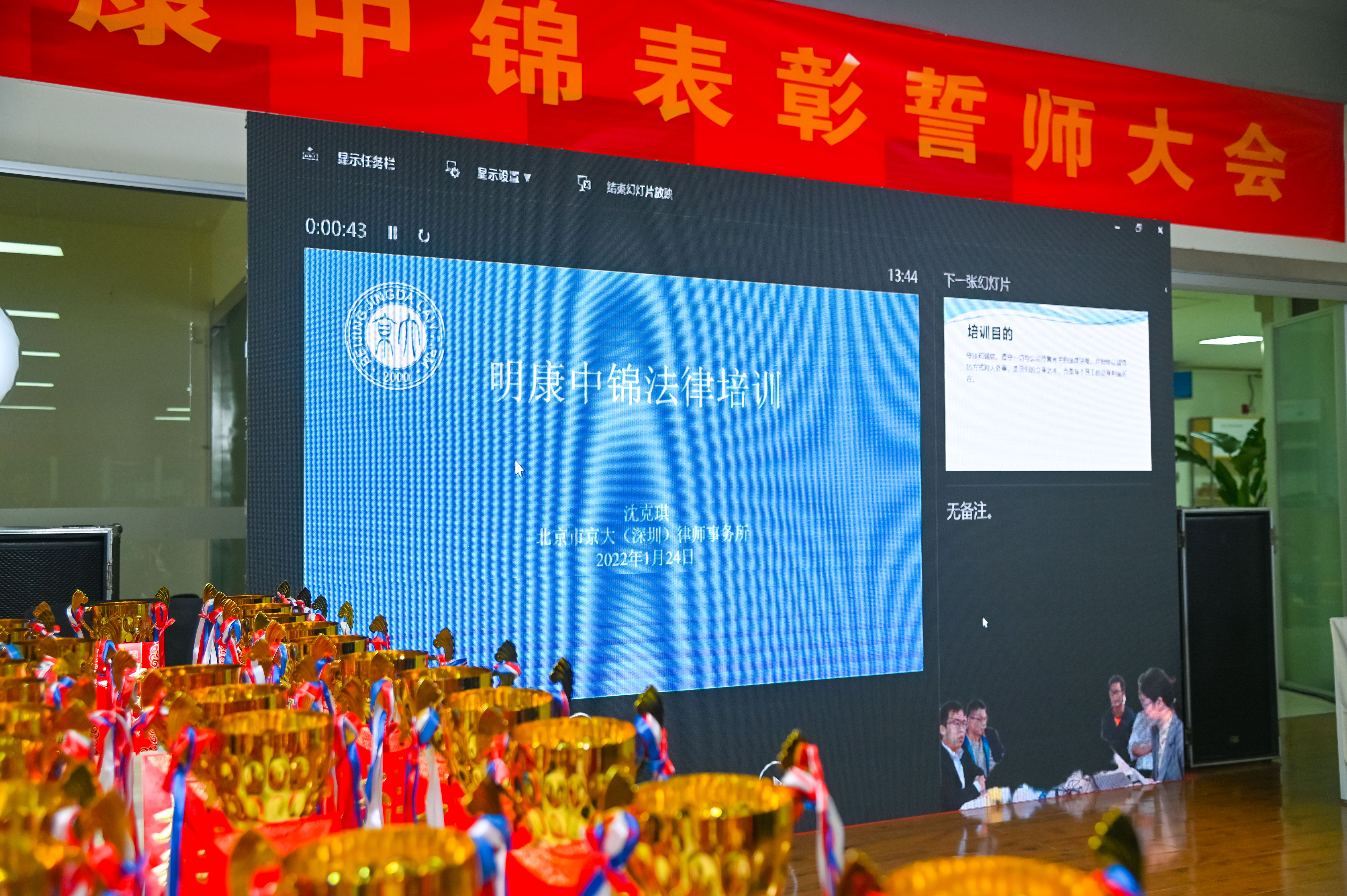 法規(guī)宣講環(huán)節(jié)結束后,參會人員認真收看公司年度大事記視頻?;厥?021,我們滿載榮譽,每一個事件、每一張畫面,都是每一個明康人努力與堅守的證明。