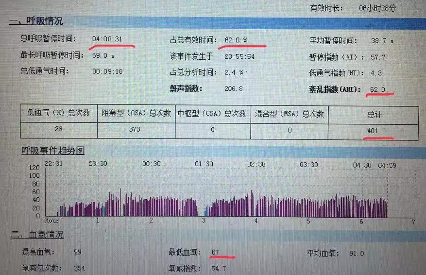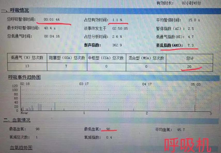 經(jīng)過(guò)醫(yī)院的睡眠監(jiān)測(cè)確定是阻塞性睡眠呼吸暫停低通氣綜合征。當(dāng)時(shí)睡眠監(jiān)測(cè)報(bào)告AHI達(dá)到62,屬于重度呼吸暫停,血氧67%,血壓160/100,有輕度的嗜睡癥狀,臉色比較蒼白,無(wú)精打采。醫(yī)生建議使用無(wú)創(chuàng)呼吸機(jī)通氣治療。