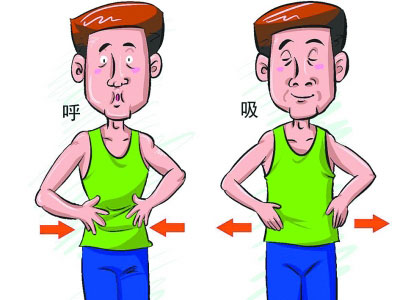 ③用縮唇呼吸法吸氣,腹部同時(shí)向內(nèi)凹。閉嘴,用鼻呼氣,腹部同時(shí)外凸,稍停片刻。
