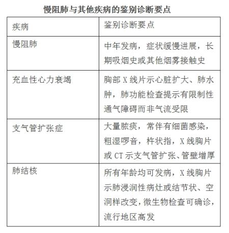 慢阻肺應(yīng)與哮喘、支氣管擴張癥、充血性心力衰竭、肺結(jié)核等相鑒別,尤其要注意與哮喘進行鑒別。