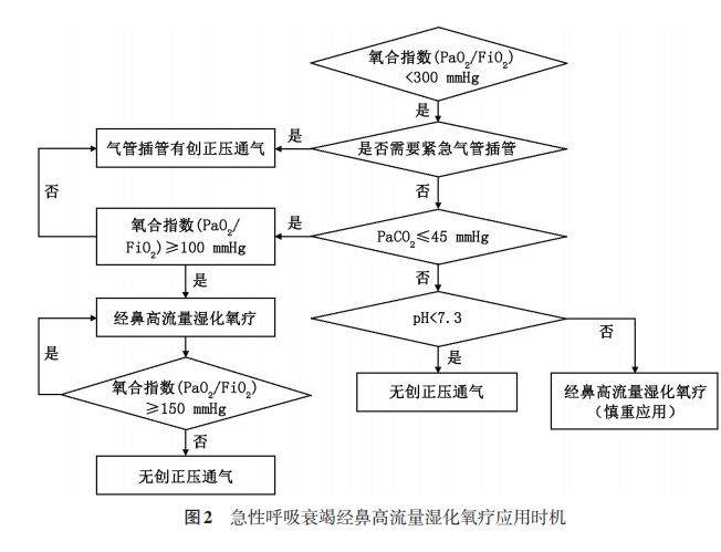 推薦建議:HFNC的適應(yīng)證是輕中度低氧血癥(100 mmHg≤PaO2/FiO2<300 mmHg,1 mmHg=0.133 kPa)、沒(méi)有緊急氣管插管指征、生命體征相對(duì)穩(wěn)定的患者;對(duì)輕度通氣功能障礙(pH≥7.3)患者也可以謹(jǐn)慎應(yīng)用,但要做好更換為NPPV或氣管插管有創(chuàng)正壓通氣的準(zhǔn)備(證據(jù)等級(jí)Ⅱ)。HFNC的禁忌證是心跳呼吸驟停、重度Ⅰ型呼吸衰竭、中重度呼吸性酸中毒高碳酸血癥(pH<7.30)、合并多臟器功能不全等(證據(jù)等級(jí)Ⅲ)。