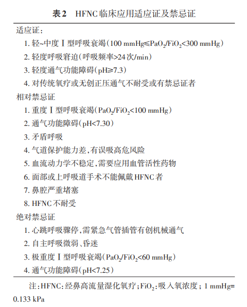 由于各研究結(jié)果間的差異[18,19,20],目前HFNC臨床應(yīng)用的適應(yīng)證和禁忌證尚無(wú)統(tǒng)一的標(biāo)準(zhǔn)。根據(jù)已發(fā)表的HFNC臨床應(yīng)用研究證據(jù),目前認(rèn)為HFNC主要應(yīng)用于治療輕~中度Ⅰ型呼吸衰竭患者[21,22,23]。對(duì)于伴有嚴(yán)重通氣功能障礙的Ⅱ型呼吸衰竭患者,由于HFNC無(wú)明顯的通氣輔助功能,且臨床療效仍不明確,此時(shí)應(yīng)慎重選擇HFNC。HFNC的應(yīng)用時(shí)機(jī)、適應(yīng)證和禁忌證見(jiàn)表2。
