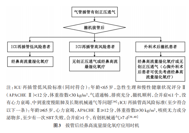 回顧性研究[36,37]結(jié)果顯示,與鼻導(dǎo)管吸氧相比HFNC可以降低再插管率,但與NPPV比較再插管率沒(méi)有明顯差異。一項(xiàng)多中心隨機(jī)研究[38]結(jié)果顯示,再次插管低風(fēng)險(xiǎn)患者(有創(chuàng)通氣撤機(jī)高風(fēng)險(xiǎn)和低風(fēng)險(xiǎn)的標(biāo)準(zhǔn)見(jiàn)圖3)拔管后接受HFNC治療,相比傳統(tǒng)氧療72 h再插管風(fēng)險(xiǎn)顯著降低;同時(shí),與傳統(tǒng)氧療相比,HFNC可以顯著降低拔管后呼吸衰竭發(fā)生率,但是兩組再次插管的時(shí)間、呼吸道感染發(fā)生率、膿毒癥發(fā)生率、多臟器功能衰竭發(fā)生率、住ICU時(shí)間、住院時(shí)間、ICU及住院病死率沒(méi)有明顯差異。另有薈萃分析研究[39]比較了成人患者拔管后使用HFNC與傳統(tǒng)氧療和NPPV之間的差異,發(fā)現(xiàn)HFNC組相比傳統(tǒng)氧療再次插管率明顯降低(OR=0.52,95% CI為0.34~0.80,P=0.003),與NPPV比較再插管率差異無(wú)統(tǒng)計(jì)學(xué)意義(OR=1.13,95% CI為0.86~1.49,P=0.38),且3組間的ICU病死率及ICU住院時(shí)間之間均沒(méi)有明顯差異。但在針對(duì)無(wú)高碳酸血癥的再次插管高風(fēng)險(xiǎn)患者的一項(xiàng)多中心的研究結(jié)果[40]顯示,HFNC組與傳統(tǒng)氧療組的再插管率、住ICU時(shí)間、住院時(shí)間及病死率沒(méi)有明顯差異。其他的研究結(jié)果表明,HFNC與傳統(tǒng)鼻導(dǎo)管氧療、文丘里面罩等比較,氧合改善更為明顯;與傳統(tǒng)NPPV比較可以降低痰液黏稠度和鼻面部壓瘡的發(fā)生率,舒適性更好[41,42,43,44]。臨床上也可以考慮HFNC與NPPV交替使用,對(duì)改善氧合與提高患者的舒適度可有效兼顧。